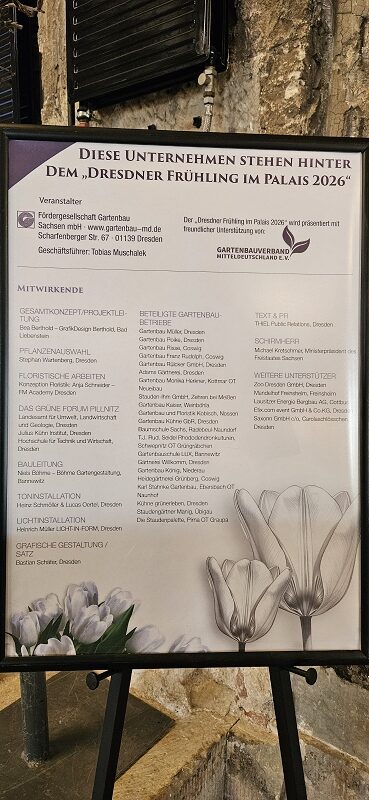Mit einer feierlichen Abendveranstaltung wurde am 26. Februar 2026 der 10. Dresdner Frühling im Palais offiziell eröffnet. Vertreter aus Politik, Wirtschaft und Gesellschaft, beteiligte Gartenbaubetriebe sowie Partner und Akteure der grünen Branche feierten gemeinsam den Auftakt der diesjährigen Blumenausstellung im Palais im Großen Garten in Dresden.