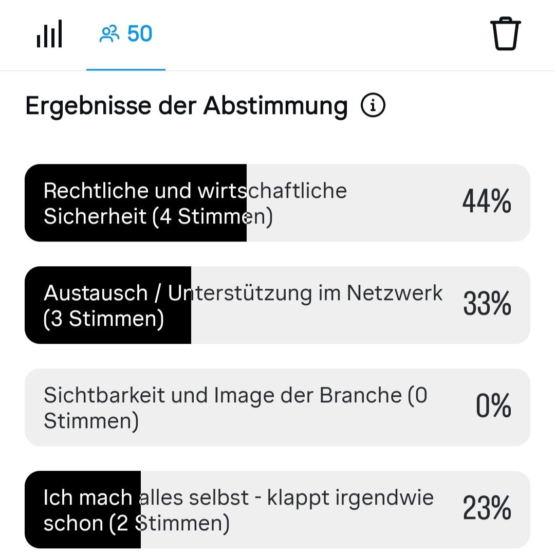 💬 Rechtliche und wirtschaftliche Sicherheit (44 %) sowie Unterstützung im Netzwerk (33 %) liegen ganz vorn. Das zeigt: Ihr wollt nicht alles allein stemmen – sondern euch auf feste Strukturen und ein starkes Miteinander verlassen können.